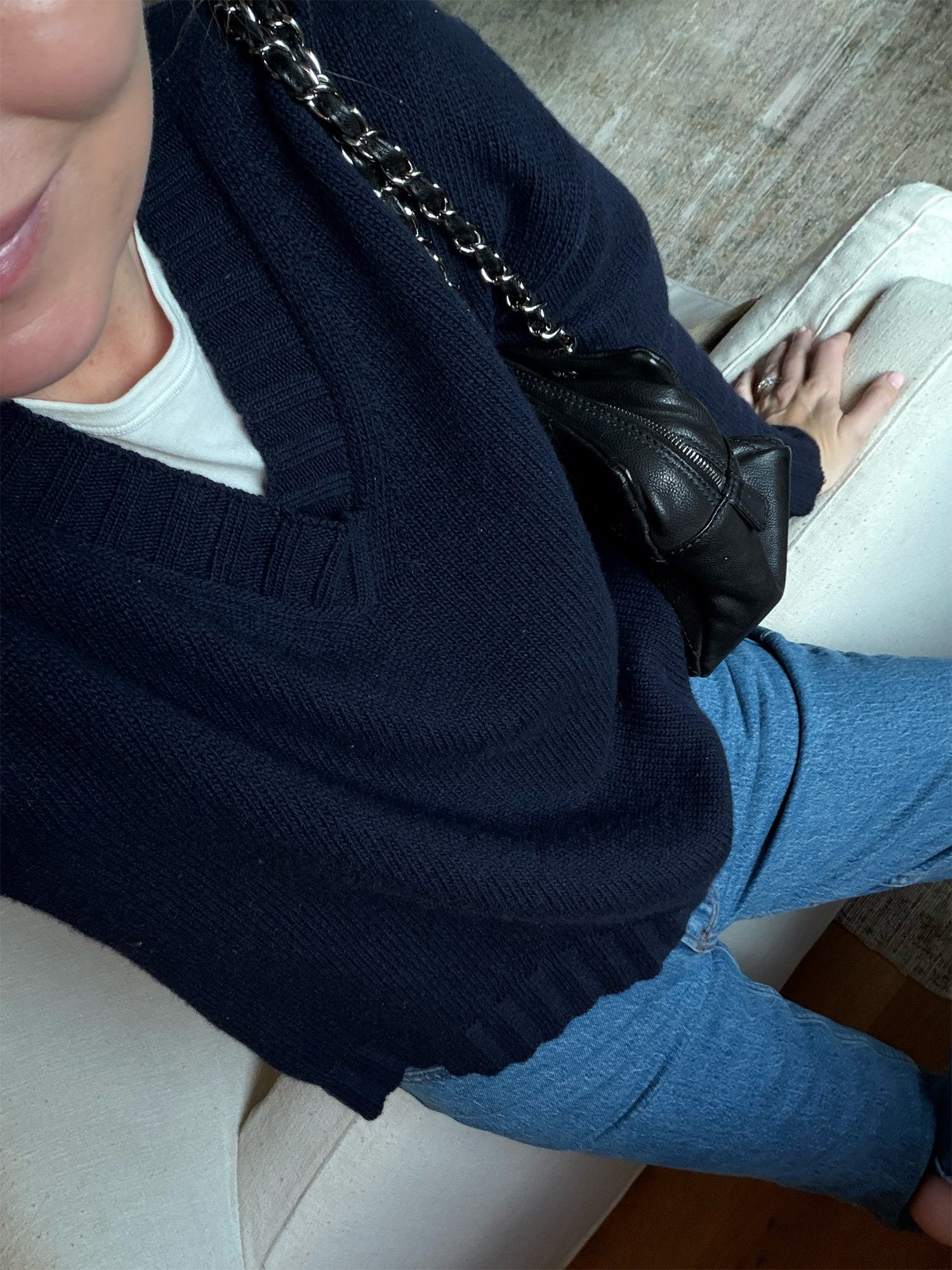 I love a navy knit. It brings the same at-home feeling as jeans and a t-shirt. It’s classic, reliable, and fresh. I am obsessed with this one! It’s the most ideal weight, hue, softness, and has such lovely details. Any time I wear this out I am asked where I got it… it’s one of those.